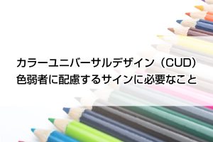 みなさんはカラーユニバーサルデザインをご存知でしょうか? もし、知らない方は是非この記事を読んで下さい! カラーユニバーサルデザインに配慮したサインについて簡単に説明させていただきます。 目次 ◆ カラーユニバーサルデ … 続きを読む カラーユニバーサルデザイン(CUD)No.1 色弱者に配慮するサインに必要なこと
