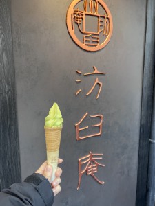 次の日に有馬温泉の近くにあるソフトクリーム屋さんで抹茶アイスを食べたのですがそこの館銘板の切文字が細くていいゴールドの色味をしていましたので思わずカメラに納めました。