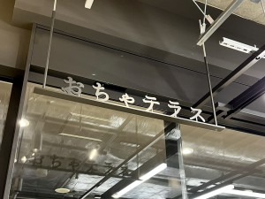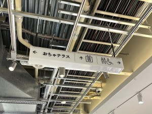 「おちゃテラス」と書いてある方を見ると、切り文字の天吊りサインが!